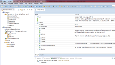 “server.xml”을 더블 클릭하면 이클립스에서 xml사용이 처음이므로 다음과 같이 xml파일이 [Design]탭이 눌려져 있는 상태로 open됩다. [Source]탭을 선택합니다.