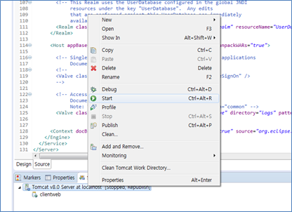 [Servers] View에 등록된 서버를 선택하고 단축메뉴를 나타낸 후 [Start]를 선택하면 서버가 start됩니다.