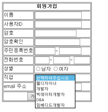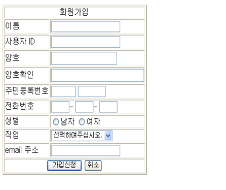 Web Application,데이터베이스 활용 전문가 양성과정/웹 [실습예제] 테이블과 form태그 연습 무적강사 2019. 7. 3. 08:34 customer.html 0.00MB 테이블 태그와 양식태그를 이용해서 회원가입 폼을 작성하세요